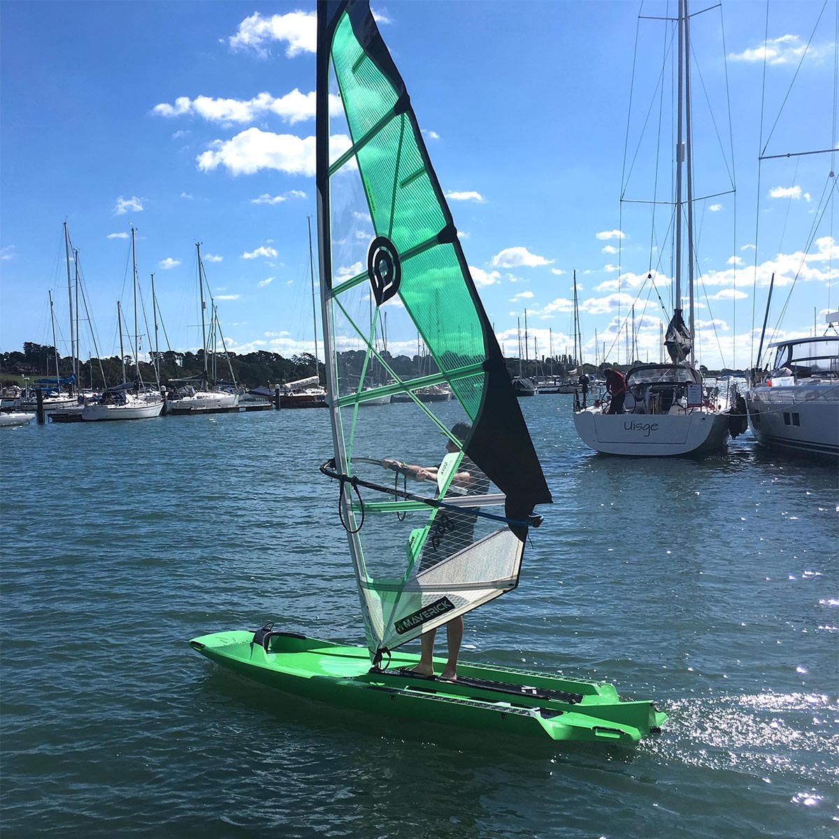 At just 11 feet in length, the Maverick is compact, easy to store, and simple to rig. Switch effortlessly between sailing, windsurfing, or paddleboarding modes, or add a wing and foil for a cutting-edge experience on the water. Its stable hull design makes it accessible for beginners while still offering excitement for more advanced riders. Whether you’re teaching sailing fundamentals, introducing newcomers to foiling, or simply looking for a fun day on the water, the Maverick delivers performance, adaptability, and fun.